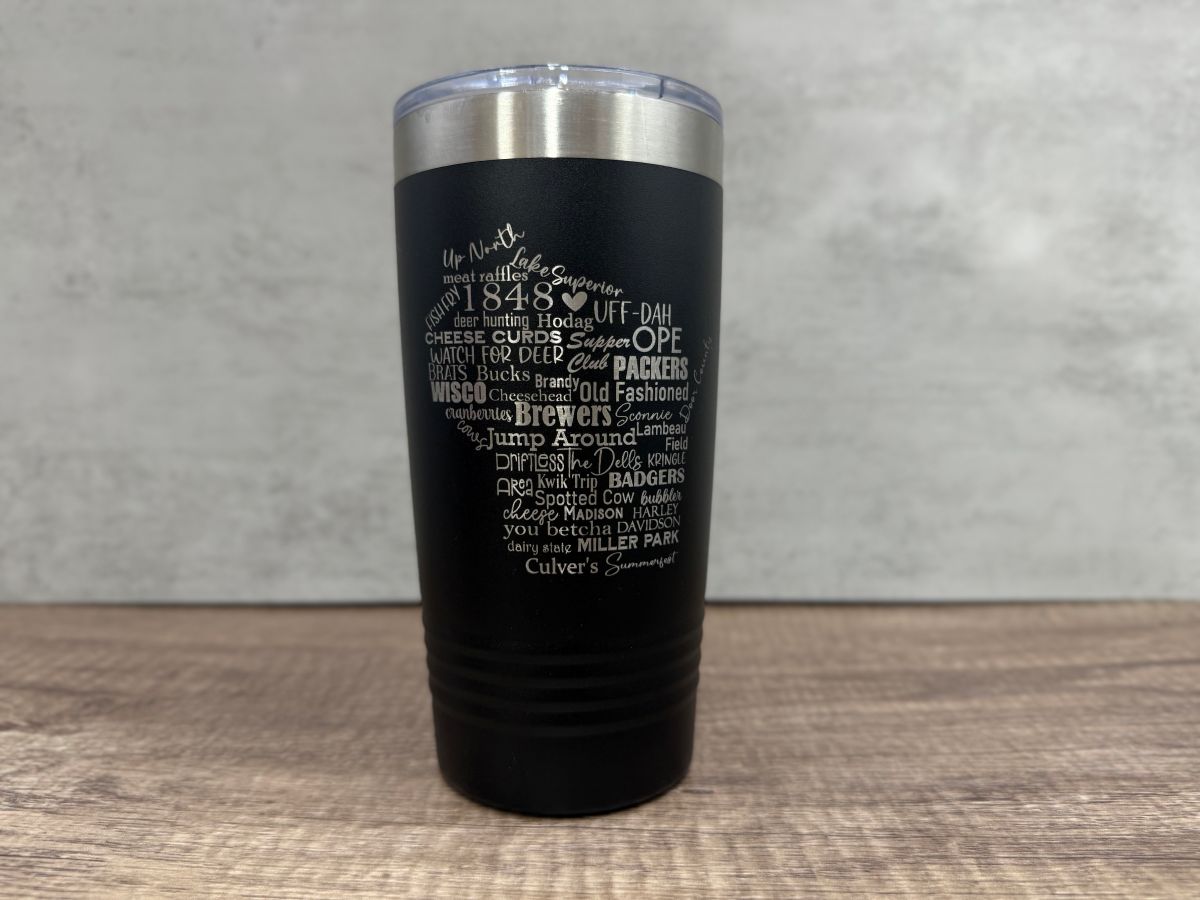 Show your Wisconsin Pride with a customized tumbler that will keep your drink hot or cold whether you are at the office, watching the Badgers/Packers/Brewers/Bucks or running errands around town. The 20 oz Polar Camel tumbler has superior heat/cold retention that is standard with all Polar Camel drinkware. It comes with a slider lid to prevent spills and is tapered at the bottom to fit most cup holders. Brand: Polar Camel Size: 20 oz Colors: Black, White, Red